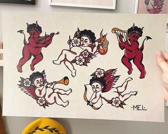 Devil And Angel Flash Cherub Angel Tattoo Flash Print Tattoo Etsy Uk