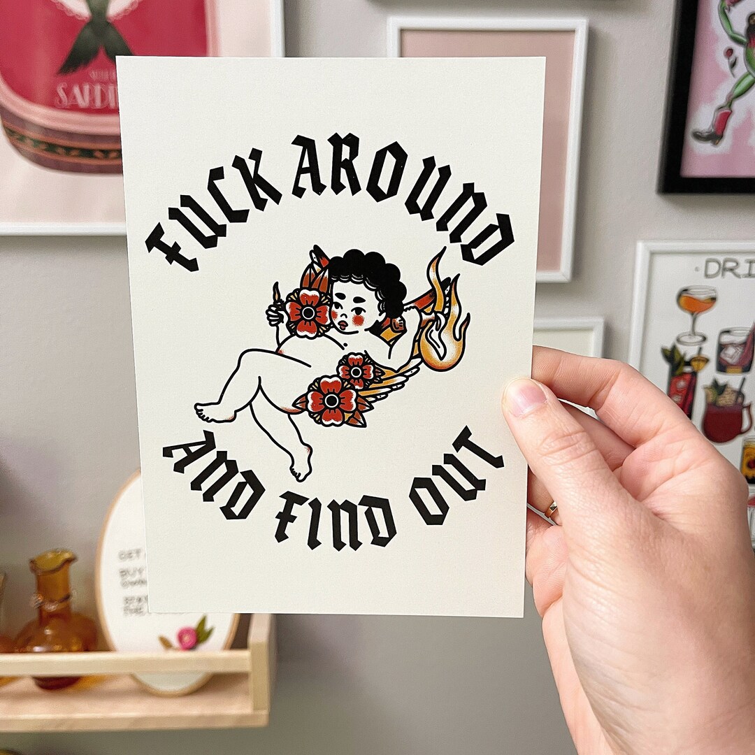 Fuck Around And Find Out Cherub Angel Tattoo Flash Print Etsy Uk